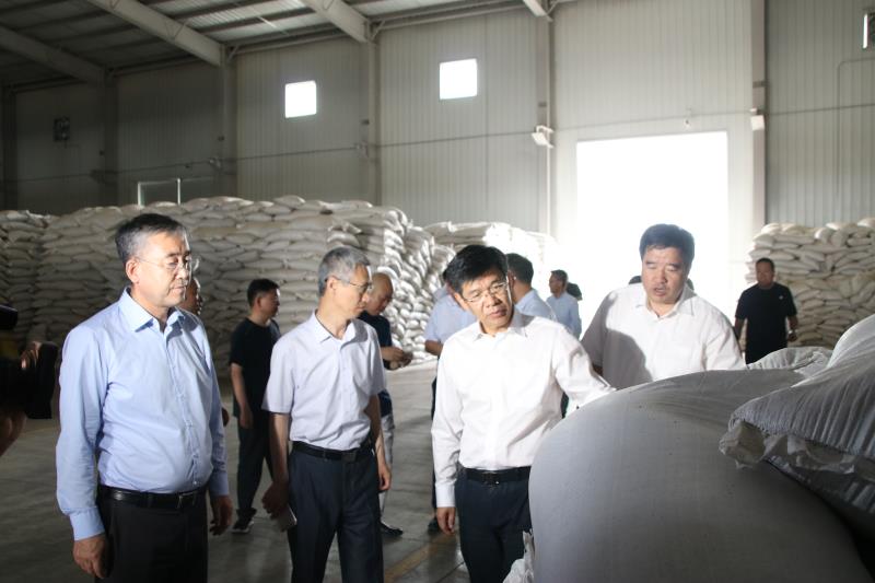 ∧黄志强(右三)、田永(右四)、刘志平(前排左二)在张占忠(右二)陪同下参观东新农业加工仓储厂区