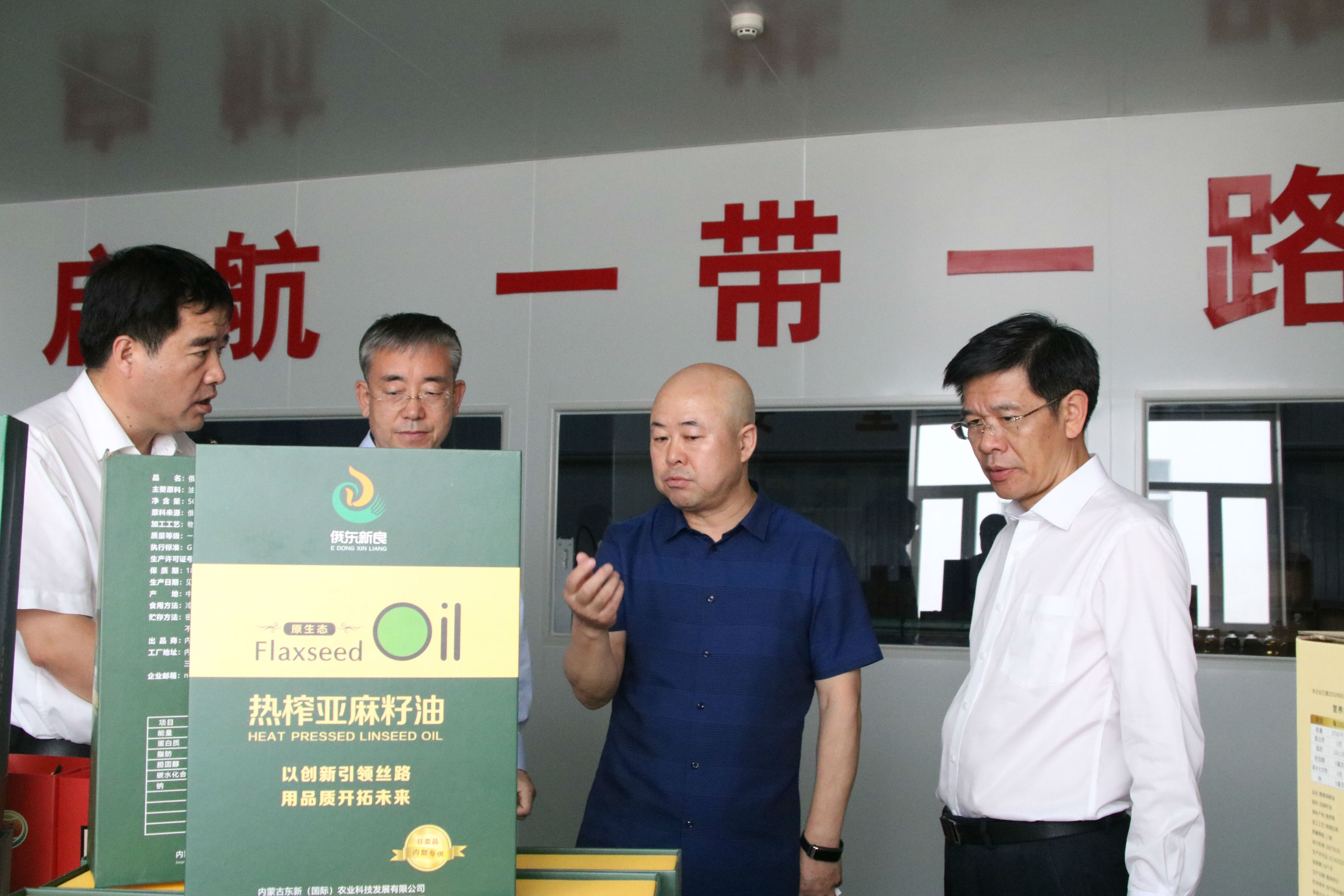∧灌装车间内,张占忠向黄志强一行介绍东新农业的亚麻籽油产品